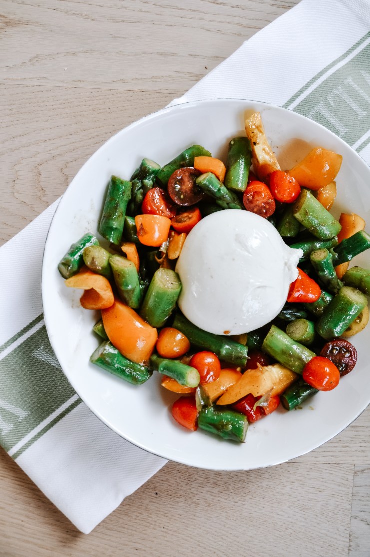 Bring water to the boil in a pan. Cut the asparagus in small pieces (remove the ends). Cook asparagus for about 3-5 minutes, you don’t want them to be too soft. Cut cherry tomatoes and pepper in pieces and mix with the cooked asparagus. Dress with the salad dressing and serve with a nice piece of burrata!