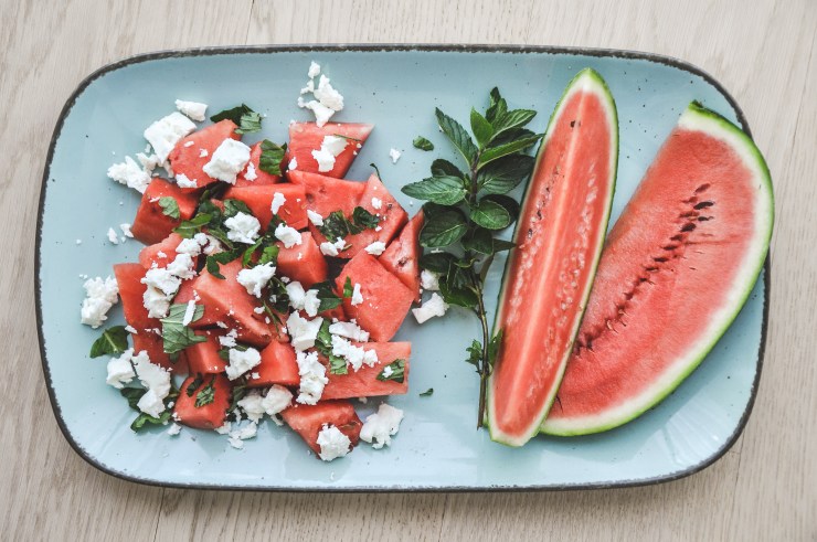 3. Distribute the watermelon on the plates, topping each with feta and mint.
