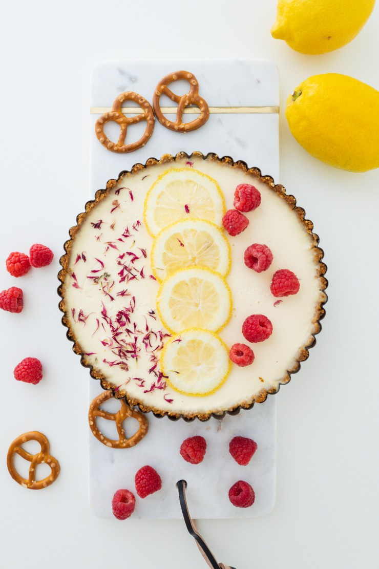 - For the crust: In a food processor pulse the crackers and pretzels, add the butter and 2 tbsp of honey and pulse until the mixture looks like a dough. Press the dough into a around 23cm tart pan. Transfer to the oven and bake until toasted, about 10 minutes.