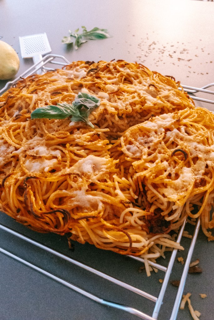 Once the spaghetti is drained, put in the Bolognese Sauce, toss well and transfer it to a pan. Put the pan on your stove and leave the cake to bake from below for 10 minutes (the bottom of the cake will be super crispy!)
