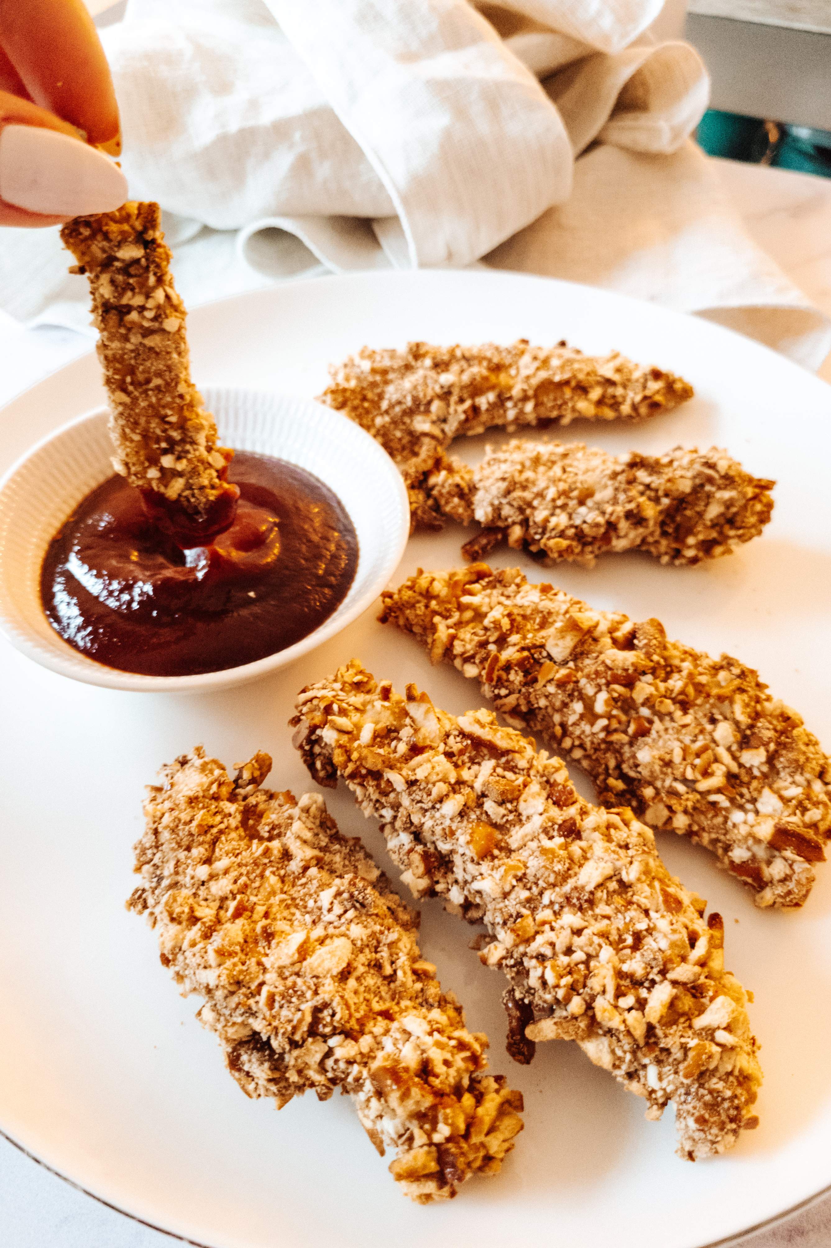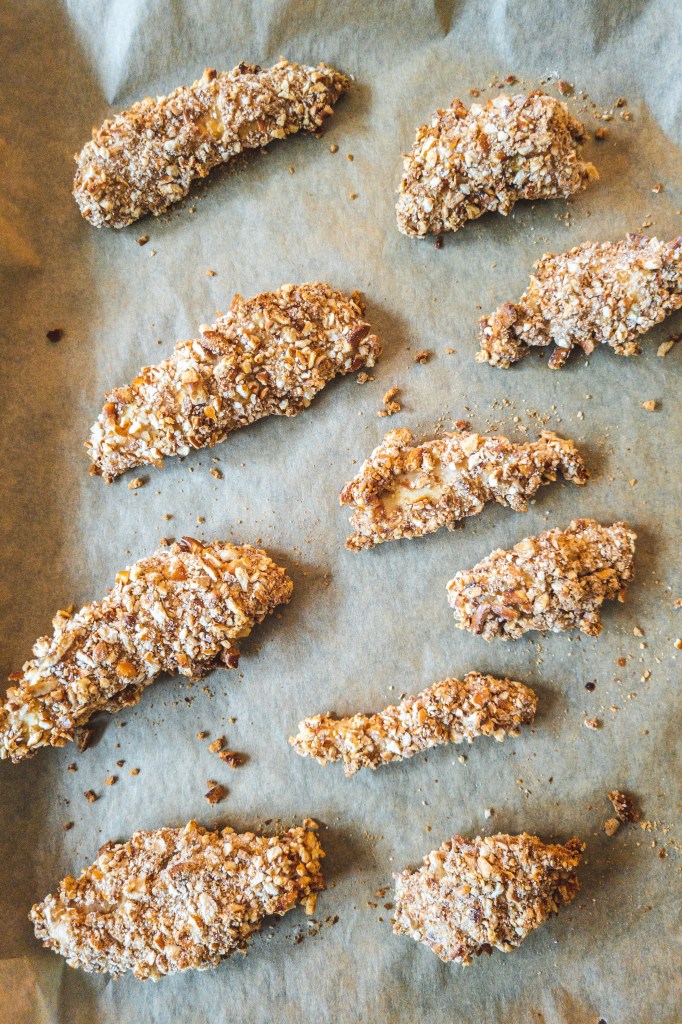 - Toss chicken strips in the flour mixture to coat, then dredge in the egg mixture. Lastly, roll chicken pieces in the crushed pretzels and place in a single layer on the baking sheet.