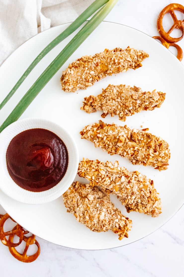 - Toss chicken strips in the flour mixture to coat, then dredge in the egg mixture. Lastly, roll chicken pieces in the crushed pretzels and place in a single layer on the baking sheet.