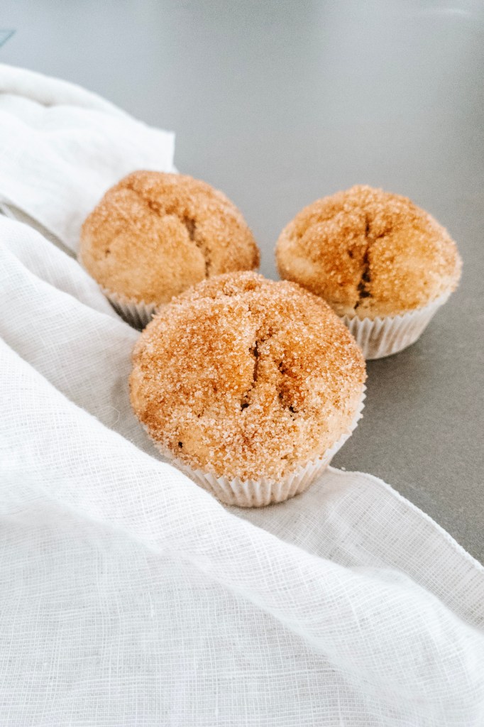 For the topping, combine sugar and cinnamon in a small bowl. Brush your cupcakes with the melted butter and place cupcakes upside down into your sugar cinnamon mixture and cover them throughly. Happy baking and enjoy!