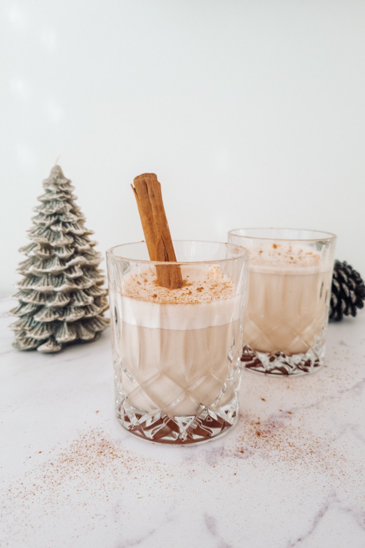 I always wondered how Eggnog tastes like since this is not really a drink that we enjoy here in Switzerland. We love to cook up some wine with spices, that’s how we do. I tried it once and it’s nice. don’t get me wrong, but Eggnog is traditionally made with eggs and sugar, milk, bourbon and nutmeg. And just drinking anything that contains raw eggs really seems weird to me so I figured I need a vegan version. So a vegan and alcohol-free version is what I created for you. I hope you’ll enjoy it as much as I do.